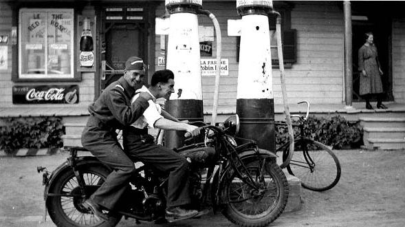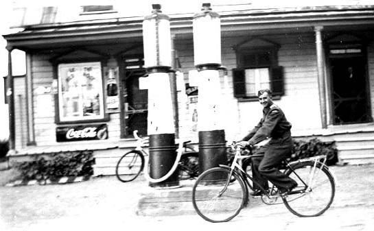 Picture of Edmour Gaudet in St-Jacques L'Achigan during WWII. The store in the background is today Jean Paul Gaudet's store.