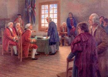 | Communications in the 17th and 18th centuries was the same speed as transportation.  The fact that the colony changed hands again between France and England was found out with a change of govenor, or military leader, or subsequent to an attack on the fort. The colony changed hands often.  You were expected to change your allegiance to the ruling crown to continue living in the area! The govenor, or power that be in an area, was supreme in all things.  Appeals by other parties were so lengthy as to be impractical. This is what Pierre 'Pitre' (1698-1775) would have been facing when he was bringing up his 8 children. What was he suppose to do when faced with the new foreign govenor who was backed by the Longknives. Before civilization takes place, brute force rules. There were several oaths required, with differences in interpretation and obligations of soldiering between the English and French. Their family was growing and expanding rapidly. It must have been a busy area with all those people working, by hand, to live and survive. Don't forget they were in one of the most northern colonies on the Atlantic coast, not a pleasant place in winter with 17th century amenities. It definitely was not the palm trees of the Caribbean! Still it was a a sheltered valley with fertile soil. |   Painting by Claude Picard. Series: Deportation of the Acadians. When the British took control of Acadia around 1730, they forced the Acadians to sign pledges of allegiance to the English Crown. The Acadians did this but they also vowed that they would never fight with the British against the French. Despite this signing, the Acadians were still forced out of their country starting in 1755. |